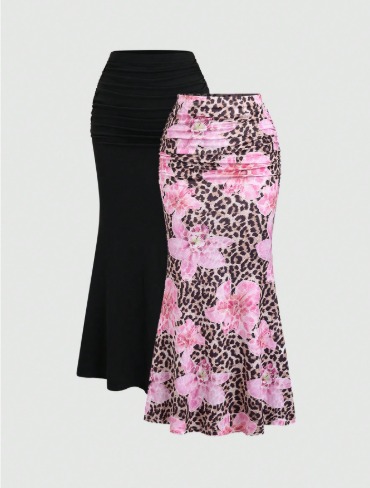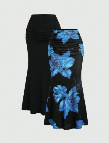 Set de 2 faldas para mujer, una de unicolor tipo sirena y otra con estampado floral, elegante para uso en fiestas.